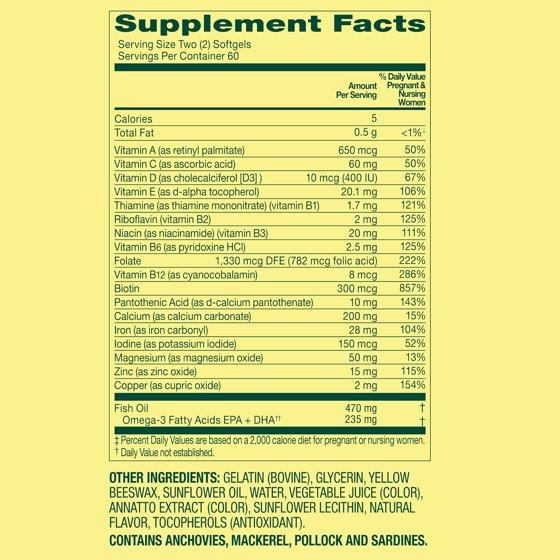 Spring Valley Prenatal Mini Multivitamin/Multimineral Supplement Mini softgels are here to help support prenatal health before, during, and after pregnancy.* Each serving contains 18 essential vitamins and minerals, along with Omega-3 Fatty Acids EPA and DHA (1) all in easy to swallow "minis" softgels. The omega-3 EPA and DHA (1) help support a baby's brain and eye development, while the 200 percent of your daily value of folate helps to support fetal spinal column development.* These softgels are free from gluten, soy, dairy, peanuts, synthetic dyes, artificial flavors, and sweeteners. The suggested does is two softgels with a meal for pregnant and nursing women. Support your prenatal health with the Spring Valley Prenatal Mini Multivitamin/Multimineral Supplement.