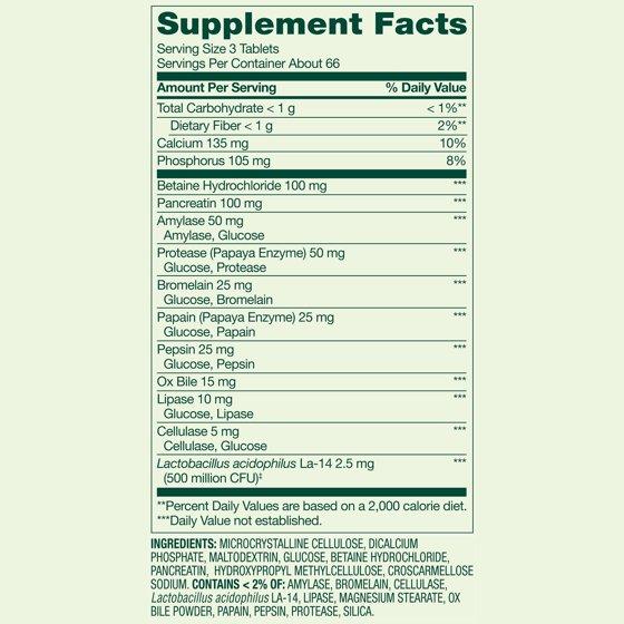 Dicalcium Phosphate, Maltodextrin, Microcrystalline Cellulose, Betaine Hydrochloride, Pancreatin, Protease, Croscarmellose Sodium. Contains < 2% Of: Amylase, Bromelain, Cellulase, Glucose, Lactobacillus acidophilus La-14, Lipase, Magnesium Stearate, Ox Bile Powder, Papain, Pepsin, Silica.