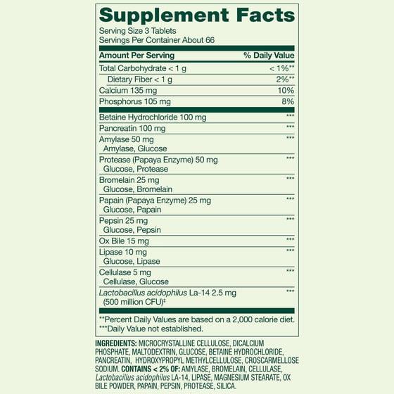Dicalcium Phosphate, Maltodextrin, Microcrystalline Cellulose, Betaine Hydrochloride, Pancreatin, Protease, Croscarmellose Sodium. Contains < 2% Of: Amylase, Bromelain, Cellulase, Glucose, Lactobacillus acidophilus La-14, Lipase, Magnesium Stearate, Ox Bile Powder, Papain, Pepsin, Silica.