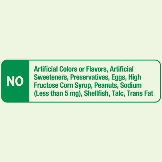 - No artificial colors or flavors, artificial sweeteners, preservatives, egg, high fructose corn syrup, lactose, milk or milk derivatives, peanuts, sodium (less than 5 mg), fish, shellfish, talc, or trans fat