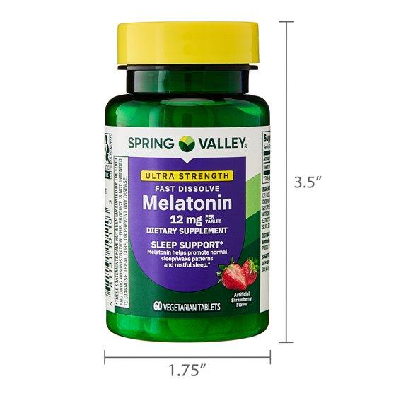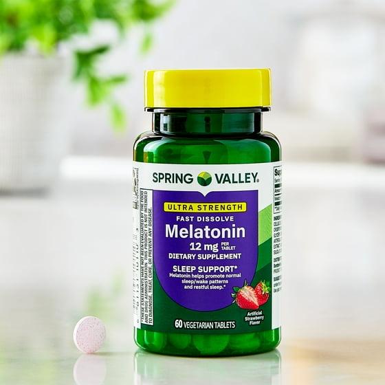 Our Spring Valley Ultra Strength Melatonin Sleep Support Dietary Supplement Fast-Dissolve Tablets are formulated to promote restful sleep.* Each tablet delivers 12 milligrams of melatonin, a naturally occurring compound produced by the body that has been associated with normal body rhythms and sleep/wake patterns.* These high potency, fast-dissolve tablets feature a delicious strawberry flavor. They also contain no gluten, lactose, artificial colors, or preservatives, and are suitable for a vegetarian diet. Adults should take one tablet prior to or at bedtime to help regulate sleep and wake cycles.* You can rest assured that Spring Valley Ultra Strength Melatonin Sleep Support Dietary Supplement Fast-Dissolve Tablets are produced with strict quality guidelines and are backed by our quality guarantee.