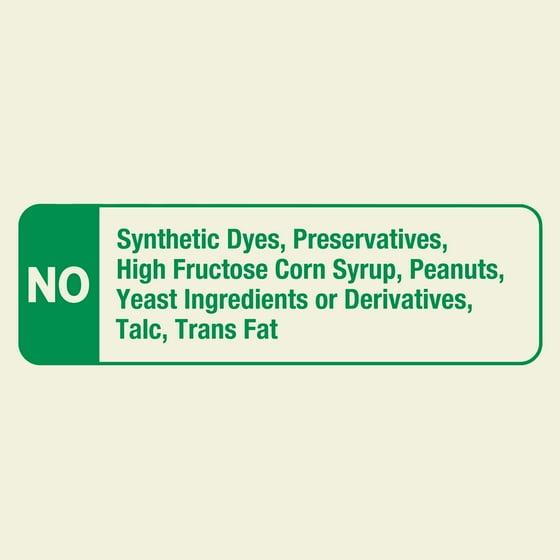 - No gluten, lactose, artificial colors, preservatives, high fructose corn syrup, peanuts, or soy