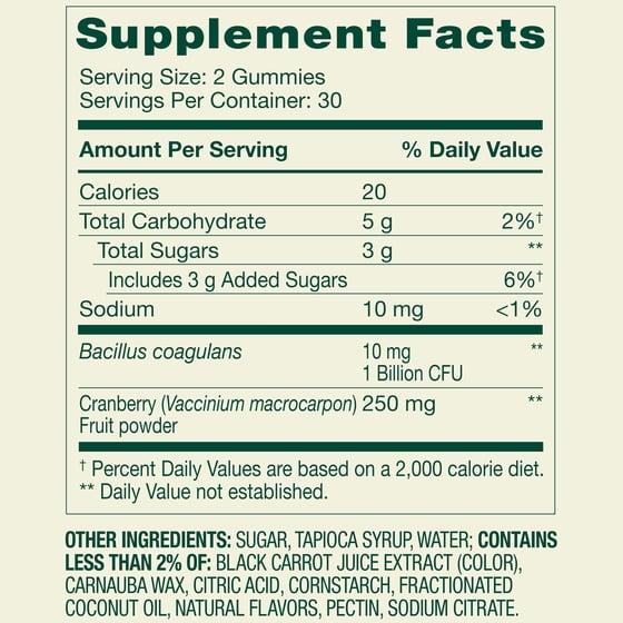 Spring Valley Women's Probiotic with Cranberry Vegetarian Gummies are the simplest, best-tasting way to support digestion health.* Probiotics are beneficial bacteria that support digestive health, support normal bowel function, and help support women's urinary tract.* Our delicious and easy to chew gummies make taking your daily probiotic a joy. With one billion CFUs and 250 milligrams of cranberry extract per serving, you'll be on the path to better health with just one Spring Valley Women's Probiotic with Cranberry Dietary Supplement Vegetarian Gummy for Digestive Health per day.