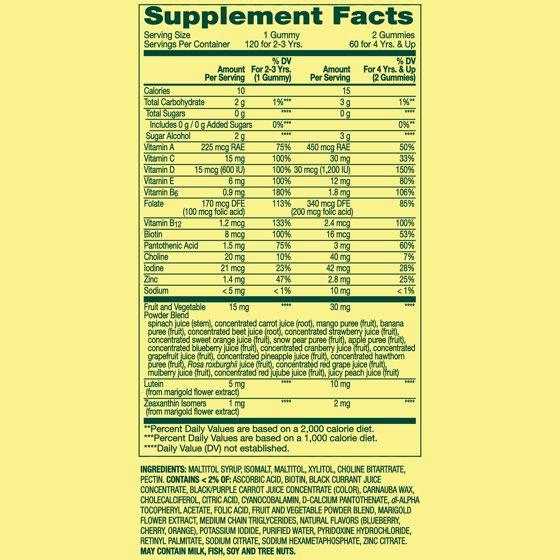 Maltitol Syrup, Isomalt, Maltitol, Xylitol, Choline Bitartrate, Pectin. Contains < 2% of ascorbic acid, biotin, black currant juice concentrate, black/purple carrot juice concentrate (color), carnauba wax, cholecalciferol, citric acid, cyanocobalamin, D-calcium pantothenate, dl-alpha tocopheryl acetate, folic acid, fruit and vegetable powder blend, marigold flower extract, medium chain triglycerides, natural flavors (blueberry, cherry, orange), potassium iodide, purified water, pyridoxine hydrochloride, retinyl palmitate, sodium citrate, sodium hexametaphosphate, zinc citrate.