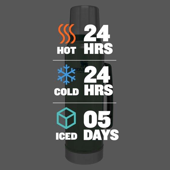 - Timeless design with double-wall vacuum insulation that keeps your drinks hot or cold for 28 hours, or iced for 150 hours.