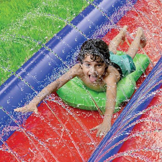- CENTERED SPRINKLER SYSTEM: The sprinkler runs between the two sliding lanes in a zigzag pattern. Both waterslide lanes get thoroughly wet without just covering the grass with puddles.