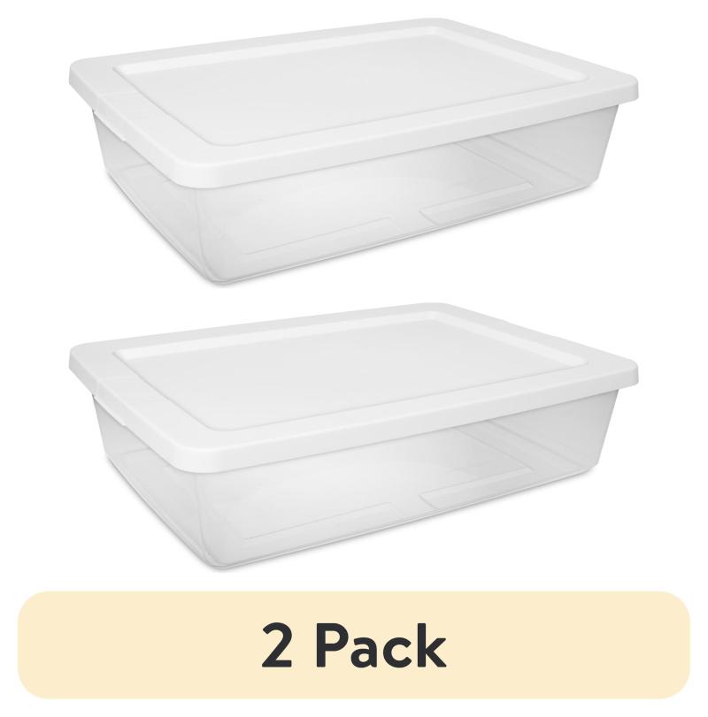 (2 pack) Sterilite 28 Quart Small Storage Bin, Clear Plastic Storage Container with Snap-On Lid, White