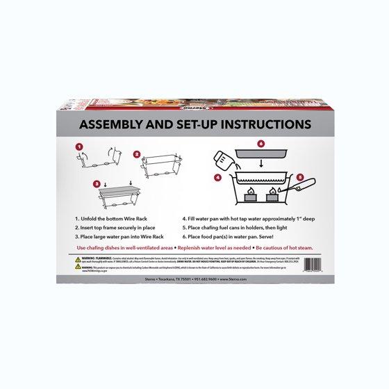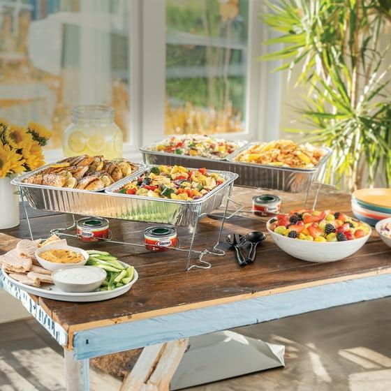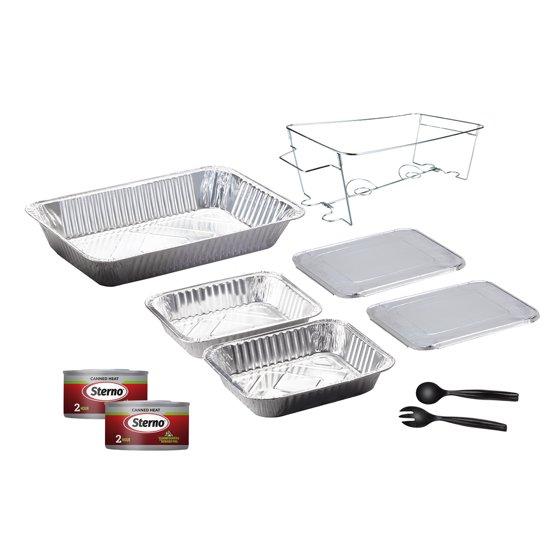 - Kit Contains: 1 Foldable Wire Rack, 1 Full-Size Aluminum Water Pan, 2 Half-Size Aluminum Food Pans, 2 Half-Size Aluminum Lids, 2 Cans of Sterno® Canned Heat, 1 Serving Spoon & 1 Serving Fork.