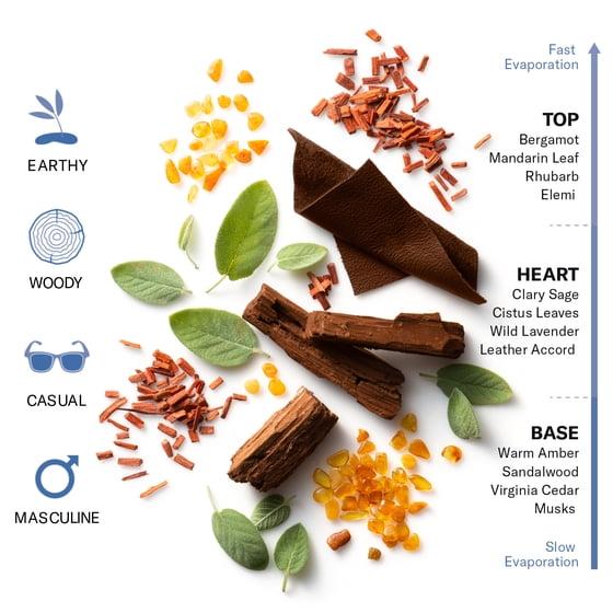 - HEART NOTES: Clary Sage, Cistus Leaves, Wild Lavender, Leather Accord
