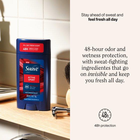 It’s more than men's deodorant. It’s game over for odor and wetness. Turn the tables on sweat. Suave Active Sport Men's antiperspirant deodorant is more efficacious than ever, a long-lasting invisible shield against wetness and odor in a stain-free stick, so you can stay on offense.