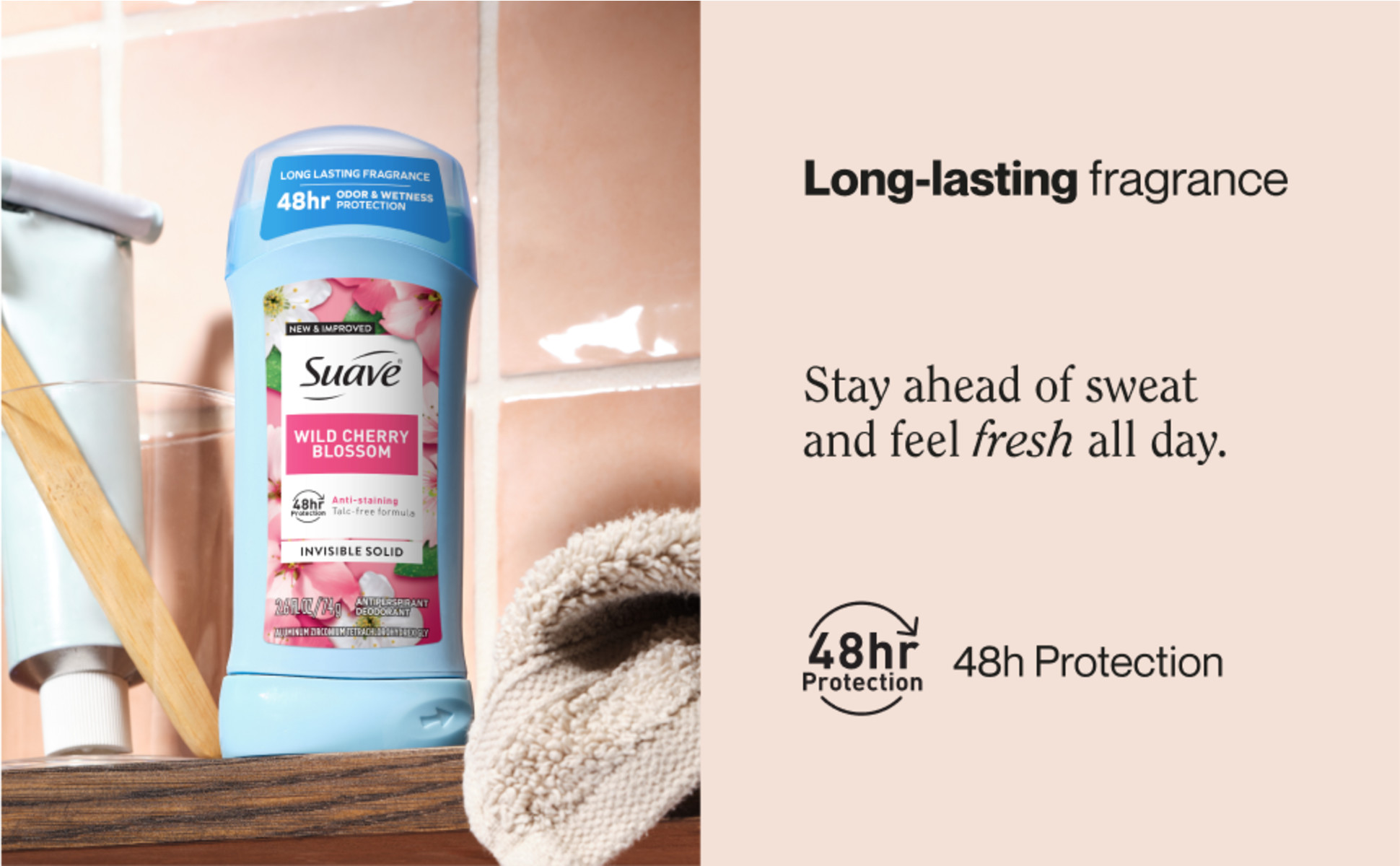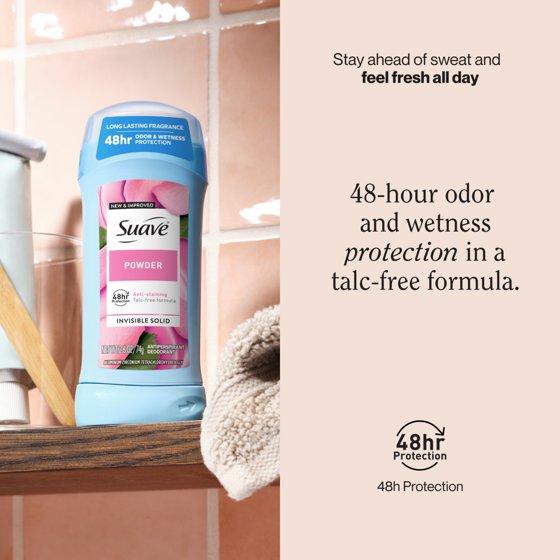 Experience the reliable freshness of Suave Powder Invisible Female Antiperspirant Deodorant Stick, expertly crafted to keep you feeling fresh and confident morning to night. This improved formula deodorant delivers reliable 48-hour protection against sweat and odor, with a light powder fragrance. Talc-free with 20% more “sweat-stopping” ingredients than our original formulation, our antiperspirant deodorant for women ensures maximum effectiveness without compromising comfort. The invisible, anti-staining female deodorant stick applies smoothly, leaving no white marks on your clothes, so you can wear what you love without worry. Suave Powder is designed to be gentle on sensitive skin while effectively combating sweat and odor, providing reliable protection and comfort for everyday use. Choose from a variety of fragrances, including Aloe & Rose Water, Cocoa Butter & Shea, Everlasting Sunshine, Mango Citrus, Powder, Fresh, Sweet Pea & Violet, Tropical Paradise, and Wild Cherry Blossom, to find the perfect match for your lifestyle. Committed to quality and accessibility, Suave empowers everyone to look, smell, and feel their best every day. For over 75 years, Suave has offered professional quality haircare and skincare products for the entire family. The Suave mission is to make gold standard quality attainable to all, so everyone can look good, smell good, and feel good every day.