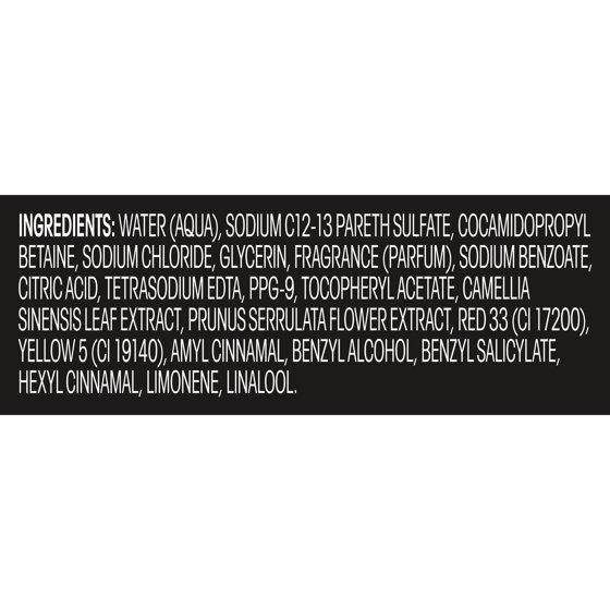Water (Aqua), Sodium Laureth Sulfate, Ammonium Chloride, Cocamide MEA, Fragrance (Parfum), Camellia Sinensis Leaf Extract, Prunus Serrulata (Cherry) Flower Extract, Glycerin, Citric Acid, Tetrasodium EDTA, PPG-9, Tocopheryl Acetate (Vitamin E Acetate), Methylchloroisothiazolinone, Methylisothiazolinone, Red 33 (CI 17200), Yellow 5 (CI 19140).