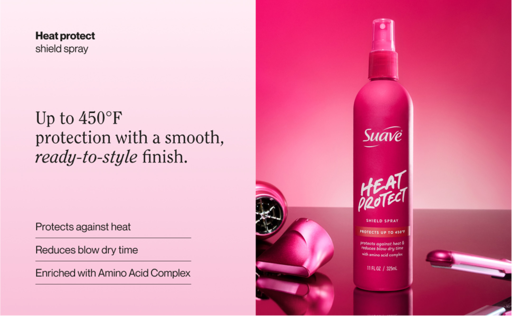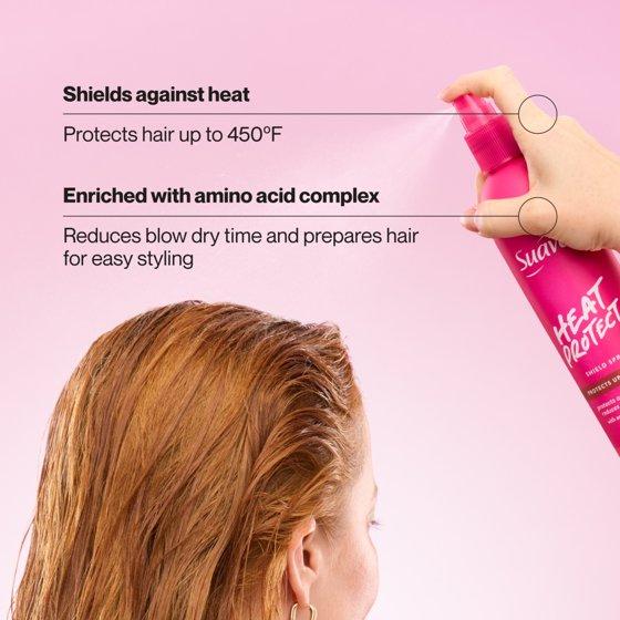 - ADVANCED HEAT PROTECTION: Suave Heat Protect Shield Spray defends hair from heat damage up to 450°F, protecting strands from flat irons, curling wands, and blow dryers