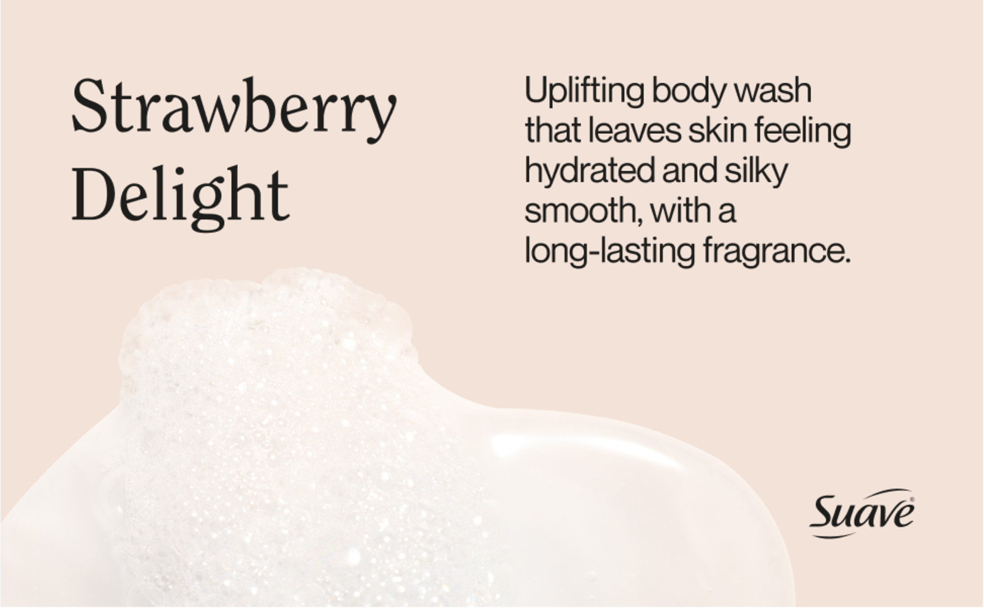 Happiness starts with strawberries. Suave Strawberry Delight Uplifting Body Wash is your ticket to a refreshing and indulgent shower experience. Formulated with nourishing glycerin and Vitamin E, this body wash hydrates your skin while delivering a gentle cleanse that leaves it feeling soft, smooth, and revitalized. The sweet scent of ripe strawberries, decadent caramel, and fluffy Chantilly cream transforms your daily routine into a delightful escape. Every wash envelops you in a rich, fruity fragrance that lingers throughout the day, making every shower feel a little more special. The lightweight formula creates a creamy lather that washes away dirt and impurities without stripping your skin of its natural moisture, making it suitable for all skin types. Suave Strawberry Delight is perfect for daily use, providing the hydration and care your skin craves. Experience the joy of rejuvenated skin with every shower, and let Suave Strawberry Delight be your go-to for a soft, silky feel and uplifting scent.