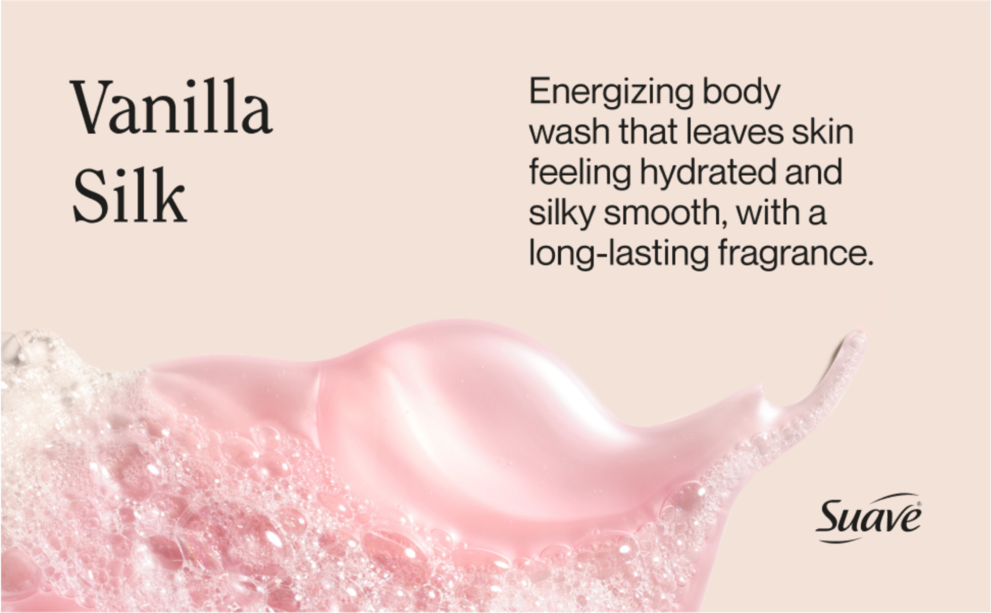 Give your skin the love it deserves with Suave Essentials Vanilla Silk Body Wash—a daily indulgence for comforting scent lovers and pampering enthusiasts. Enriched with glycerin and vitamin E, this formula nourishes your skin to keep it soft, smooth, and hydrated. The creamy, foaming lather gently cleanses without stripping natural moisture, leaving your skin soft, smooth, and nourished after every wash. Infused with fragrance notes of rich vanilla cream, sparkling rose, and sandalwood it transforms your shower into a spa-like escape. With its family-size bottle, this moisturizing body wash offers salon-quality skincare at an affordable price— perfect for daily use by the whole family. Treat your skin to hydrating body wash that delivers both deep moisture and irresistible scent—because feeling great in your skin should be an everyday luxury. Like all Suave products, our body washes are cruelty-free and never tested on animals. They are also free of parabens and phthalates. For over 75 years, Suave has offered professional quality haircare and skincare products for the entire family. Suave is committed to quality and accessibility, with a mission to make gold-standard products attainable for everyone, empowering people to look, smell, and feel their best every day.