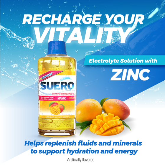 - Suero Repone Electrolyte Liquid Solution with delicious Mango flavor!