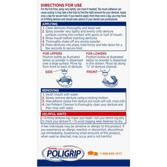 - Extra Strength Super Poligrip Denture Adhesive Powder offers a strong 12 hour hold and helps prevent irritating food particles from getting trapped under your denture