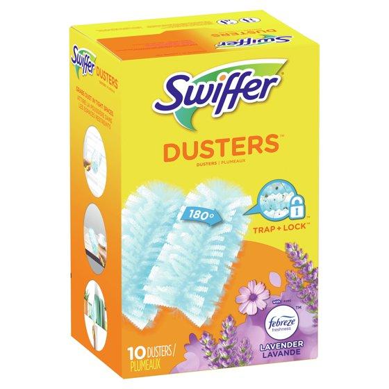 - Swiffer Dusters TRAP + LOCK dust wherever dust shows up, including fan blades, blinds, car interior, keyboard vents, bookcases, and more. They are made with specially coated fibers that grab onto dust & don't let go. Enjoy the lasting freshness* of Gain as you clean. *Leaves behind up to 1 hour of freshness after initial product use