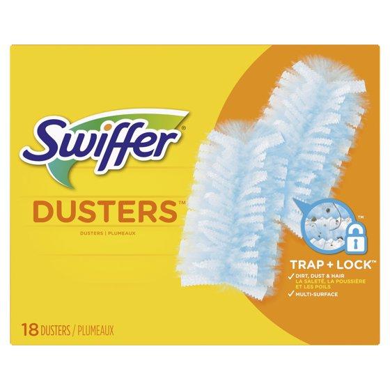 - Swiffer Dusters TRAP + LOCK dust wherever dust shows up, including fan blades, blinds, car interior, keyboard vents, bookcases, and more. They are made with specially coated fibers that grab onto dust & don't let go.