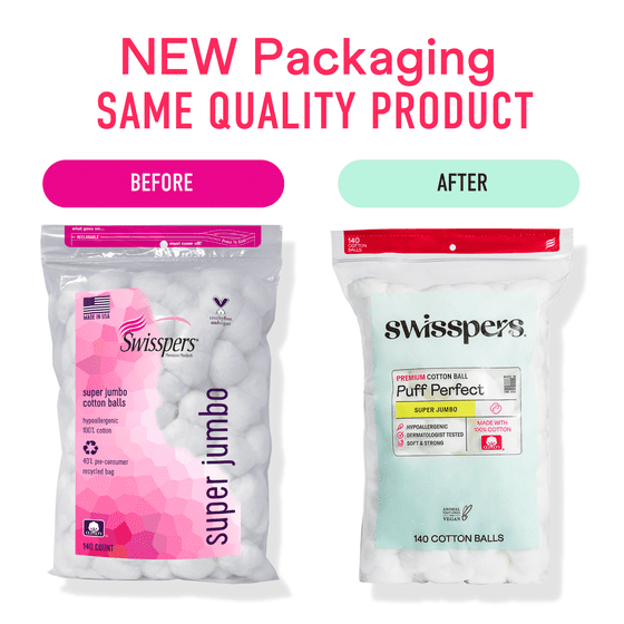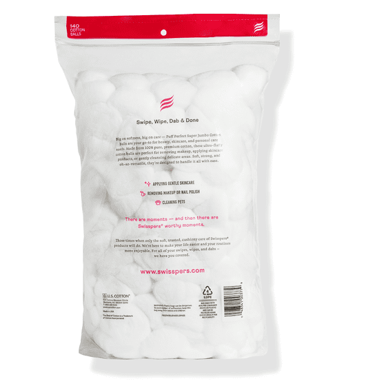 These Swisspers premium hypoallergenic super jumbo cotton balls can be used for multiple applications. They can be used for various arts and crafts projects, treating wounds, applying various makeup or face cleansers, and much more. They're made from 100 percent cotton, giving them a soft feel that's easy to deal with. These jumbo-size cotton balls are ideal for even the most sensitive skin. These pieces are oversized in order to handle double the duty peruse. They'll make a useful addition to any makeup regimen. The balls come in a bag that has a count of 140 total individual pieces. They can help remove nail polish or can be used to make a centerpiece of an art project. They'll make an important part of a beauty kit, first aid kit, and much more.