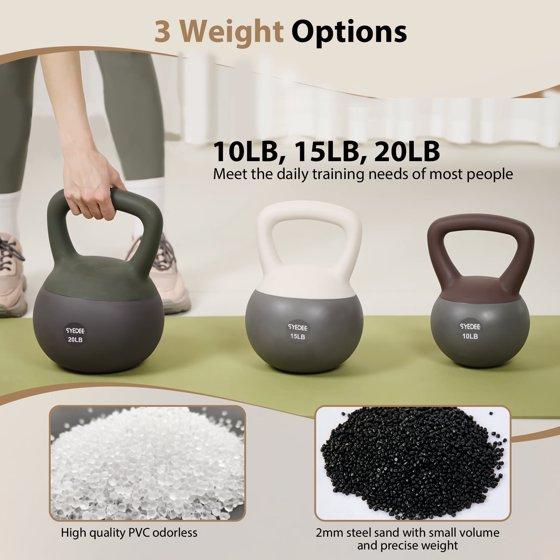 - 【 45 pound soft kettlebell set 】 3 weight options -10 pounds, 15 pounds, 20 pounds. Meet the daily training needs of most people. Multi-functional soft kettlebell set, complete full body training with one set of kettlebells. Such as Goblet Squat, Kettlebell Swing, Alternating Clean & Press, Kettlebell Hip Thrust......