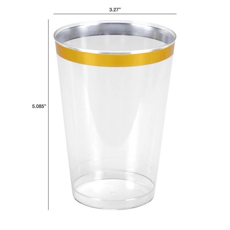 Crafted from durable, BPA-free plastic, each tumbler features a crystal-clear body that mimics the appearance of real glass, accented by a metallic gold rim that adds a hint of sophistication. The sturdy base provides stability on tabletops, while the smooth rim offers a comfortable drinking experience. Perfect for serving everything from water and soda to wine, cocktails, or champagne, these cups are both stylish and practical.