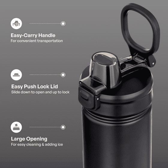- Push-Button Lid with Lock: One-handed access with a secure locking mechanism to prevent leaks.