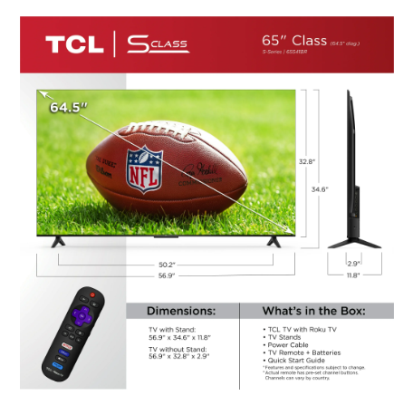 TCL 65” Class S4 (65S41BR) 4K UHD HDR LED Smart TV with Roku TV (NEW 2024)