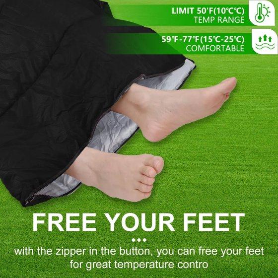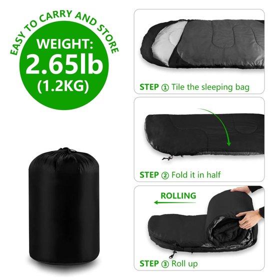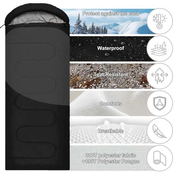 Comfort temperature is 50℉-68℉ (10℃-20℃). Recommended limit temperature is 41℉-77℉ (5℃-25℃). Our sleeping bag easily fits a 6ft adult and weighs only around 2.6lbs. It's perfect for spring, summer, fall, and cool weather. The ultra-strong, waterproof outer protective shell is made from our unique waterproof hex-tech design, double-layered with S-shape stitching, and 3D inner synthetic fiber fill for optimal warmth and insulation to protect you from the elements.