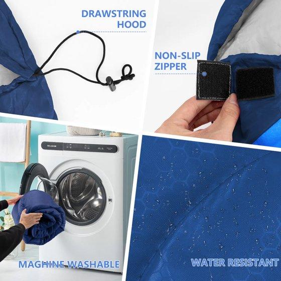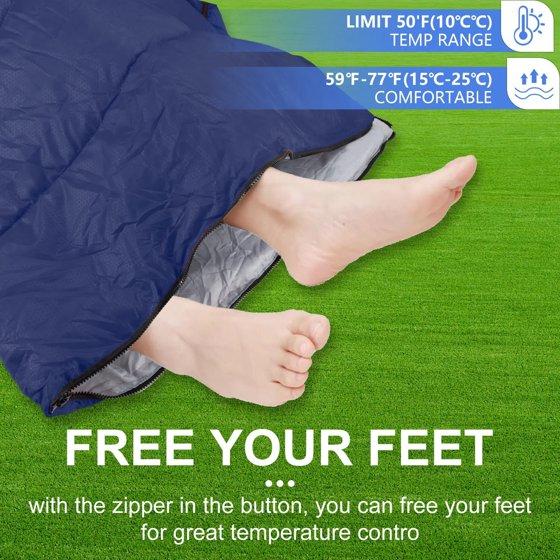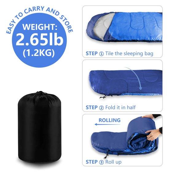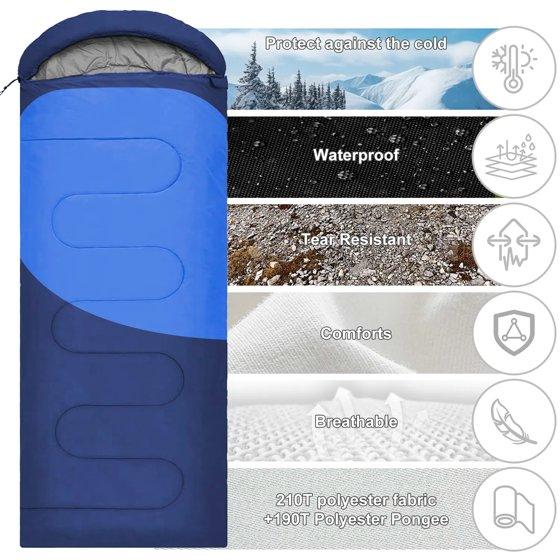 Comfort temperature is 50℉-68℉ (10℃-20℃). Recommended limit temperature is 41℉-77℉ (5℃-25℃). Our sleeping bag easily fits a 6ft adult and weighs only around 2.6lbs. It's perfect for spring, summer, fall, and cool weather. The ultra-strong, waterproof outer protective shell is made from our unique waterproof hex-tech design, double-layered with S-shape stitching, and 3D inner synthetic fiber fill for optimal warmth and insulation to protect you from the elements.