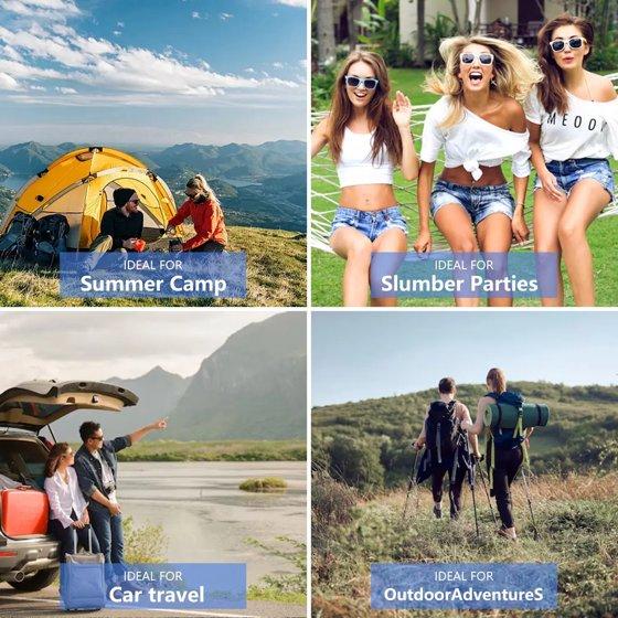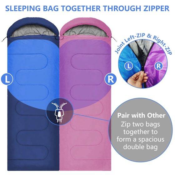 When you're looking for a sleeping bag or quilt, you'll quickly find that there are a lot of options out there. So that's why we created this sleeping bag for women, teens, and kids, this sleeping bag with dimensions of 86.6 x 31.5in and weighing only 2.6 pounds. It could be fully opened to be a blanket for picnic or play. Convenient to carry along for any outdoor adventures with the carry bag. And the rated temperature is 50-68℉. Camping sleeping bag is made of premium 210T ripstop microfiber fabric, lined with 190T polyester pongee. Waterproof outer shell and polyester fiberfill for optimal warmth and insulation. It's perfect for spring, summer, fall, and cool weather. The fabric is waterproof and difficult to stain, easily to clean by wiping and also machine washable.