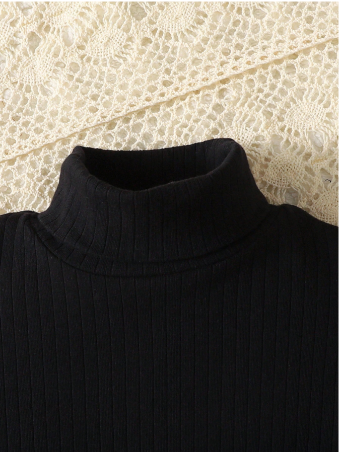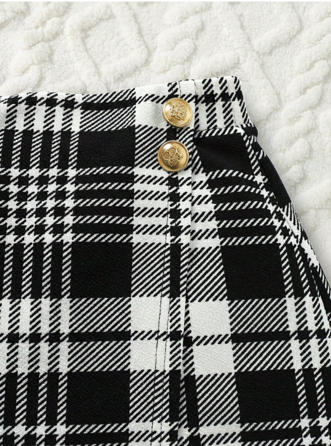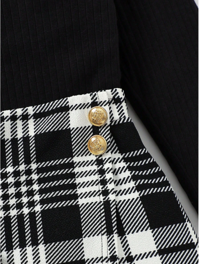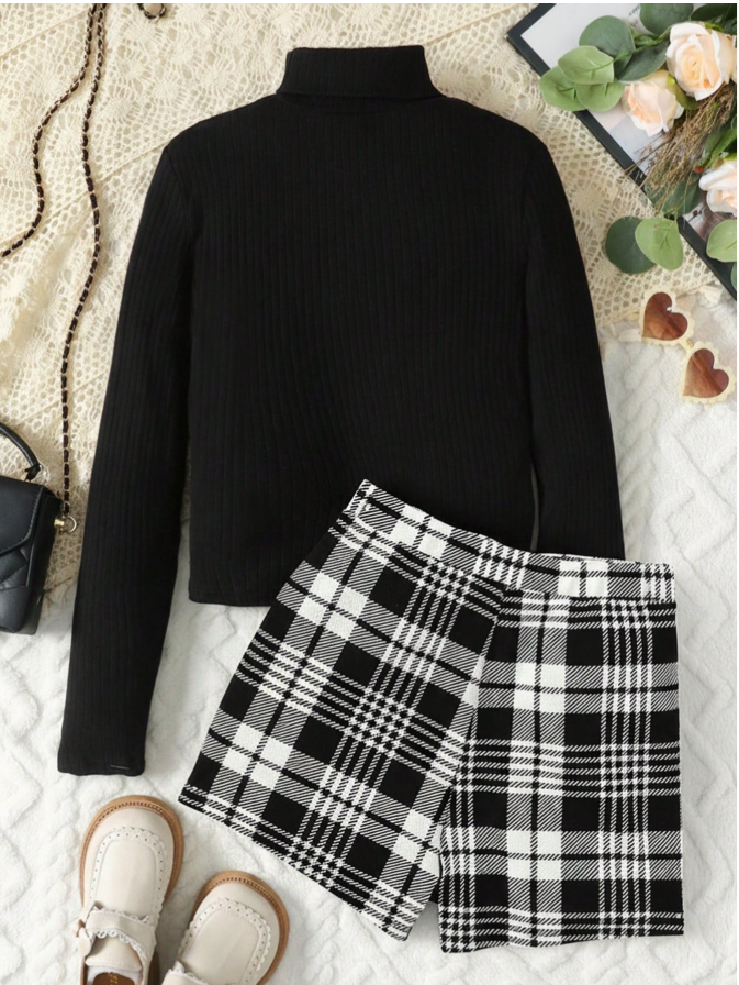 Teen Girl Fitted Casual Minimalist Comfortable Turtleneck Sweater & Plaid Mini Skirt Set Suitable For Everyday, School, Vacation, Party Occasions