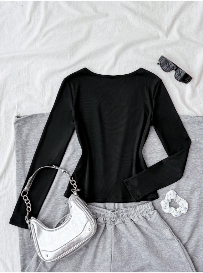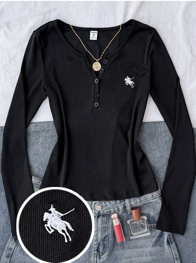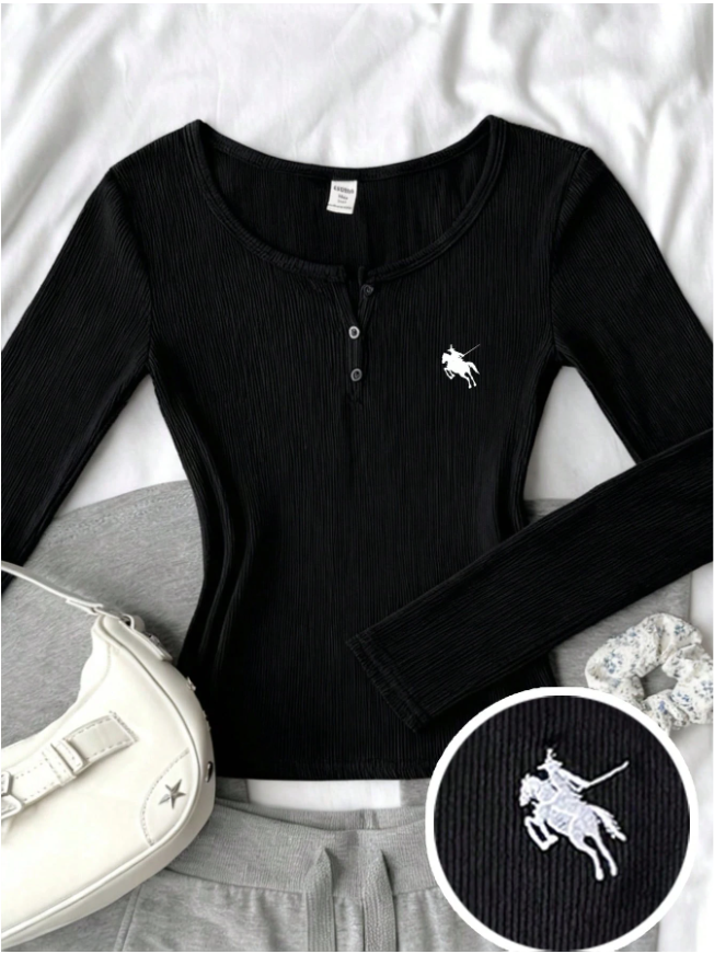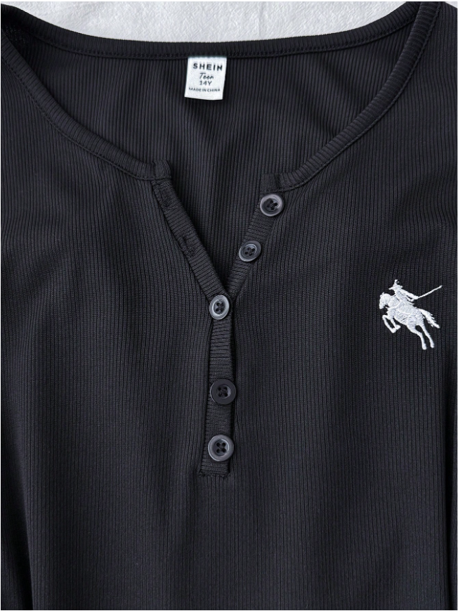 Teen Girls Ribbed Knit Crew Neck Cardigan, Long Sleeve Casual Classic T-Shirt Top With Embroidered Logo, Autumn/Winter