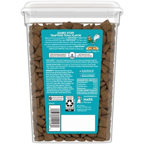 Temptations Jumbo Stuff Tempting Tuna Flavor Crunchy And Soft Dry Cat Treats, 14 Oz Tub: Cats love the delicious taste of Temptations Classic Cat Treats, so give your cat more of what they love with Temptations Jumbo Stuff Tempting Tuna Flavor Cat Treats. Just shake the pack, and they’ll come running. Each of these tasty tuna flavor cat treats is 2 calories and provides an irresistible combination of both crunchy and soft textures. These cat treats also come in a resealable, value-sized tub, so your feline friend can enjoy their favorite cat snacks when you open them, but not when they shouldn’t! Temptations Jumbo Stuff cat treats are the perfect large treat addition to your cat’s regular feeding routine - use them as a treat, a meal, or a cat food topper. Temptations Jumbo Stuff cat treats are the purr-fect way to show your feline friend how much you care.