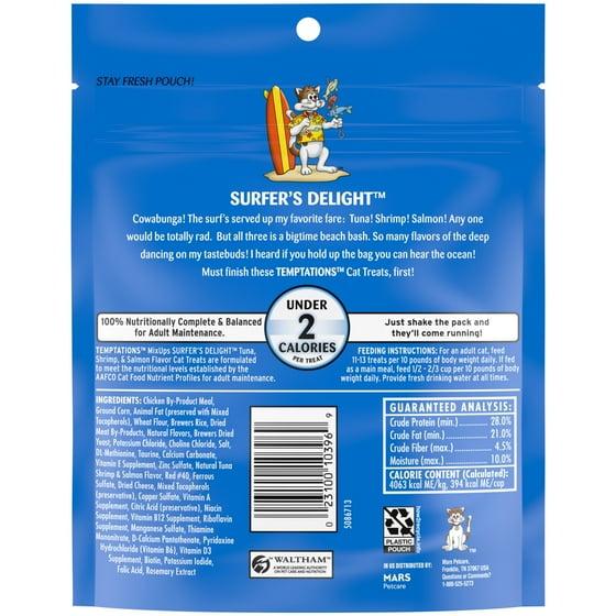 Did your fussy feline greet you with a chorus of purrs when you got home? Reward your cat with a mix-n-match of their favorite playtime cat treats. Temptations MixUps Surfer's Delight is a trifecta of tempting treats with a mix of tuna, shrimp, and salmon flavors. Each of these tasty cat treats has less than 2 calories and provides an irresistible combination of both crunchy and soft textures. They're excellent-sized treats for cat toys, so try placing a few inside a treat dispenser toy and watch your furball chase and swat away. Temptations MixUps comes in a resealable pouch, so your fur-friend can enjoy their favorite cat treats when you open it… but not when they shouldn’t! Temptations MixUps are the purr-fect crunchy and soft cat snack to show your feline friend how much you care.