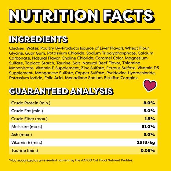 Chicken, Water, Poultry By-Products (source of Liver Flavor), Wheat Flour, Glycine, Guar Gum, Potassium Chloride, Sodium Tripolyphosphate, Calcium Carbonate, Natural Flavor, Choline Chloride, Caramel Color, Magnesium Sulfate, Tapioca Starch, Taurine, Salt, Natural Beef Flavor, Thiamine Mononitrate, Vitamin E Supplement, Zinc Sulfate, Ferrous Sulfate, Vitamin D3 Supplement, Manganese Sulfate, Copper Sulfate, Pyridoxine Hydrochloride, Potassium Iodide, Folic Acid, Menadione Sodium Bisulfite Complex.
