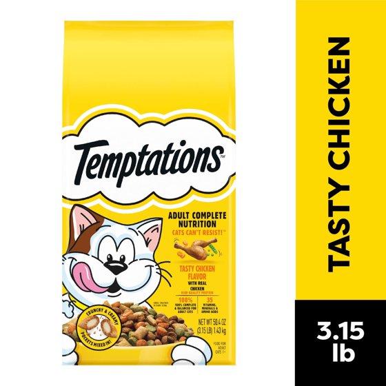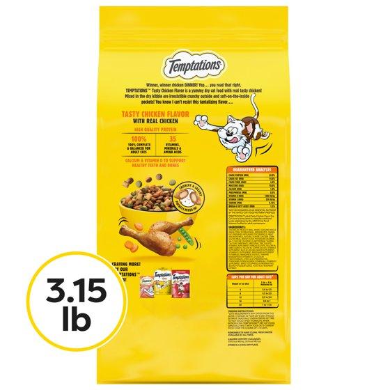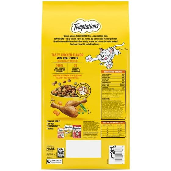 - Your cat will come running for Temptations Adult Dry Cat Food Tasty Chicken Flavor.