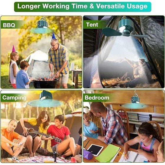 1 This compact USB fan combines the functions of a camping light, ceiling fan and emergency mobile power. With a large 7500 mAh battery capacity, this small camping fan provides 8-36 hours of operating time on a full charge in 6-8 hours.