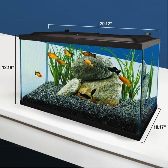 - ACCESSORIES: Kit also includes a fish net, Tetra AquaSafe water conditioner sample, TetraMin food sample and set-up guide. 10 GALLON TANK: Measures 20 inches wide by 10 inches deep by 12 inches high.