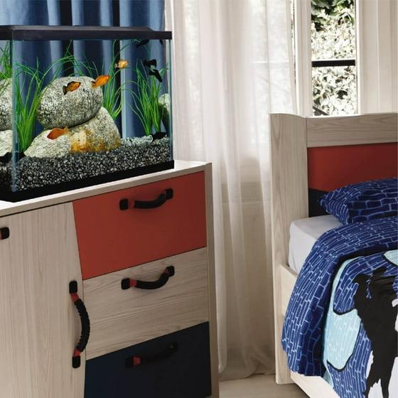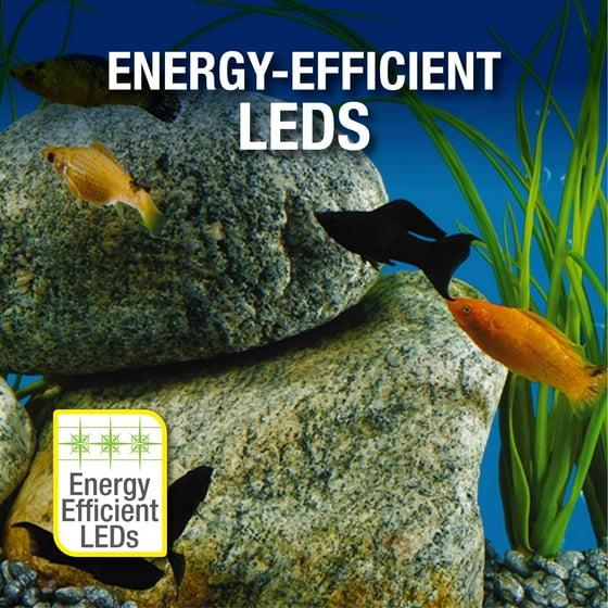 - GLASS AQUARIUM KIT: Glass aquarium with low-profile hinged hood houses energy efficient white LEDs to create a natural underwater shimmer effect.