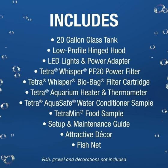 The Tetra Complete LED Aquarium Kit comes with items you need to create a healthy home for your fish. This complete kit includes a 20-gallon glass aquarium, a low-profile, hinged hood with LED lighting system, the Tetra Whisper PF20 Power Filter with a Tetra Whisper Bio-Bag Filter Cartridge, a Tetra Aquarium heater and thermometer, AquaSafe water conditioner sample, TetraMin food sample and a setup and maintenance guide. The included Tetra Internal Filtration System features mechanical filtration to catch debris and chemical filtration with Ultra-Activated Carbon for removal of odors, discoloration and toxins. The energy-efficient LED Lighting system gives you a beautiful natural daylight effect. Approximate dimensions 24 inches x 12 inches x 16 inches. Attractive artificial plants add a natural ocean feel. Add gravel and fish to complete your aquarium. Small aquariums are a great way to get started in the freshwater fishkeeping hobby, and with any new hobby involving living creatures, it is always best to learn as much as you can. When buying fish, ask your retailer for guidance in choosing the right fish for your size aquarium. Caution: Children under age 13 should have adult supervision with setup, maintenance and fish care.