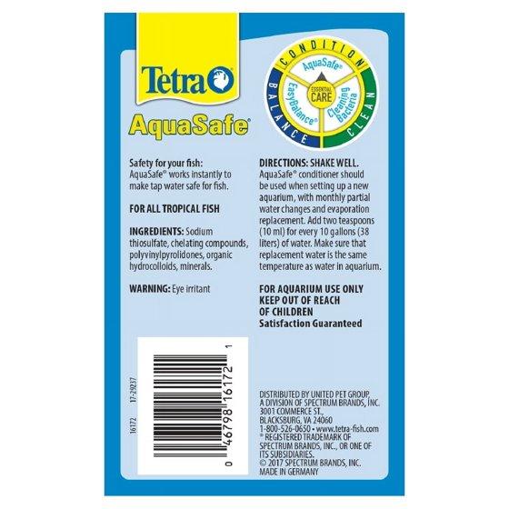 Tetra AquaSafe 8.45 Ounces, aquarium Water Conditioner, Makes Tap Water Safe Tetra AquaSafe removes chlorine to make tap water safe for fish in your aquarium. Use it monthly to condition water and protect fish works instantly. The powerful slime reduces stress. Treat water when setting up a new aquarium and with monthly partial water changes or evaporation replacement. Add 2 teaspoons (10 mL) for every 10 gallons (38 liters) of aquarium water. Make sure that replacement water is the same temperature as water in your aquarium.Use Tetra AquaSafe every month as part of a 3-step program for essential water care: Tetra Cleaning Bacteria cleans the aquarium, removing ammonia and sludge; Tetra AquaSafe conditions water to make tap water safe for fish; and Tetra EasyBalance balances water quality to reduce phosphates, add vitamins and regulate pH levels. Since 1951, Tetra has developed the world's most comprehensive body of fish food knowledge, and fishkeeping enthusiasts have looked to the brand for products and solutions that add ease and beauty to their home. Whether you're an experienced hobbyist or just starting out, Tetra has everything you need-from a large variety of quality fish food and innovative equipment to test kits and decor.