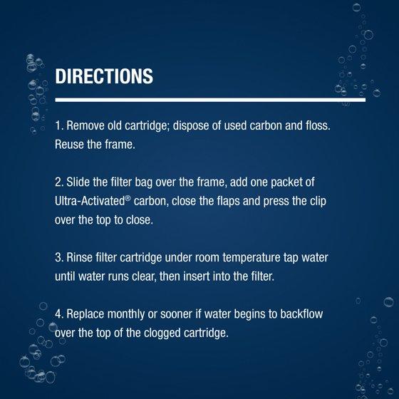 Tetra ReptoFilter Cartridge refills work effectively to keep water crystal clear and remove odors from terrarium water. These disposable filter cartridges are tough on debris – Ultra-Activated carbon absorbs odors and discoloration, and dense, dual-sided mesh catches debris and waste. They’re convenient, fully assembled and ready to use. Use these medium-sized filters with Tetra ReptoFilter 20 gallon, Viquarium™ and Decorative ReptoFilter. Replacing cartridges is fast and easy. Rinse the cartridge under cold water to remove carbon dust, then remove the Tetra® ReptoFilter lid and insert the cartridge into “V” slots and slide it all the way down into the filter. Replace monthly, or when water begins to backflow over the top of the clogged cartridge.