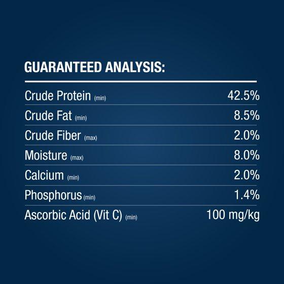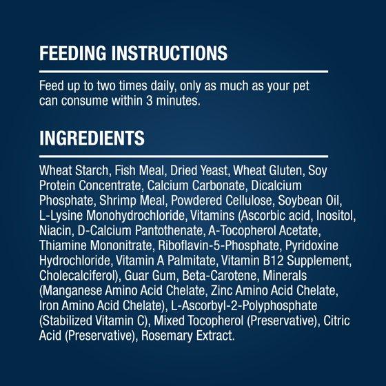 Wheat starch, fish meal, dried yeast, wheat gluten, soy protein concentrate, calcium carbonate, dicalcium phosphate, shrimp meal, powdered cellulose, soybean oil, L-Lysine monohydrochloride, Vitamins (Ascorbic acid, Inositol, Niacin, D-Calcium Pantothenate, A-Tocopherol Acetate, Thiamine Mononitrate, Riboflavin-5-Phosphate, Pyridoxine Hydrochloride, Vitamin A Palmitate, Vitamin B12 supplement, Cholecalciferol), Guar Gum, Beta-Carotene, Minerals (Manganese amino acid chelate, Zinc amino acid chelate, Iron amino acid chelate), L-Ascorbyl-2-Polyphosphate (Stabilized Vitamin C), Mixed Tocopherol (preservative), Citric Acid (preservative), Rosemary Extract.