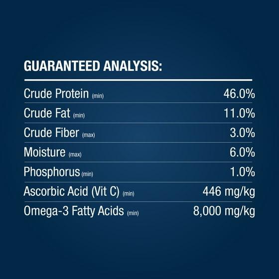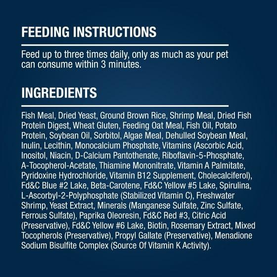 Fish Meal, Dried Yeast, Ground Brown Rice, Shrimp Meal, Dried Fish Protein Digest, Wheat Gluten, Feeding Oat Meal, Fish Oil, Potato Protein, Soybean Oil, Sorbitol, Algae Meal, Dehulled Soybean Meal, Inulin, Lecithin, Monocalcium Phosphate, Vitamins (Ascorbic Acid, Inositol, Niacin, D-Calcium Pantothenate, Riboflavin-5-Phosphate, A-Tocopherol-Acetate, Thiamine Mononitrate, Vitamin A Palmitate, Pyridoxine Hydrochloride, Vitamin B12 Supplement, Cholecalciferol), FD&C Blue #2 Lake, Beta-Carotene, FD&C Yellow #5 Lake, Spirulina, L-Ascorbyl-2-Polyphosphate (Stabilized Vitamin C), Freshwater Shrimp, Yeast Extract, Minerals (Manganese Sulfate, Zinc Sulfate, Ferrous Sulfate), Paprika Oleoresin, FD&C Red #3, Citric Acid (Preservative), FD&C Yellow #6 Lake, Biotin, Rosemary Extract, Mixed Tocopherols (Preservative), Propyl Gallate (Preservative), Menadione Sodium Bisulfite Complex (source of Vitamin K activity)