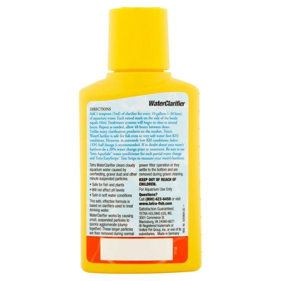 Tetra Water Clarifier 3.38 Ounces, Clears Cloudy aquarium Water Tetra Water Clarifier clears cloudy aquarium water caused by overfeeding, gravel dust and other minute suspended particles. This phosphate-free liquid solution is safe to use in all freshwater aquariums. This effective formula works by causing small, suspended particles to quickly clump together. These larger particles are then removed during normal power filter operation. This formula is based on clarifiers used to treat drinking water. It's safe to use with fish and plants and will not affect water pH levels in your aquarium. Unlike many clarification products on the market, Tetra Water Clarifier is safe for fish even in very soft water (low KH) conditions. However, in extremely low KH conditions, below 1KH, half dosage is recommended. If in doubt about your water's hardness, perform a 20% water change before treatment. Be sure to use Tetra Aqua Safe water conditioner for each partial water change and Tetra Easy Strips Test Strips to measure your water's hardness. Since 1951, Tetra has developed the world's most comprehensive body of fish food knowledge, and fishkeeping enthusiasts have looked to the brand for products and solutions that add ease and beauty to their home. Whether you're an experienced hobbyist or just starting out, Tetra has everything you need, from a large variety of quality fish food and innovative equipment to test kits and decor.