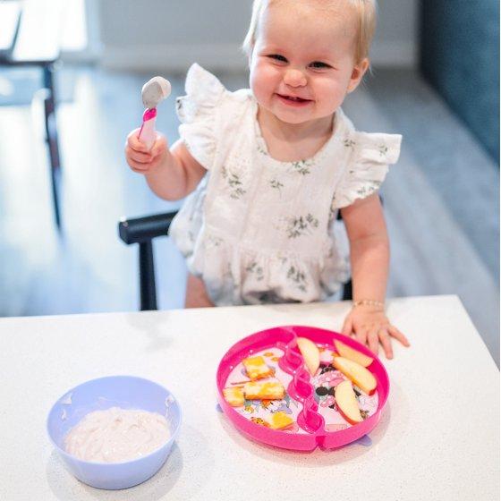 - Minnie Mouse Dinnerware Set: Invite Minnie over for mealtime fun with this 3-piece toddler feeding set that’s perfectly sized for little ones learning to self-feed