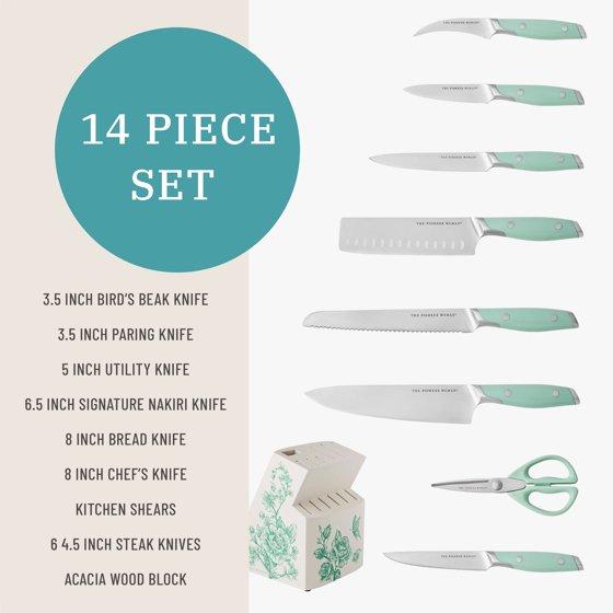 The Pioneer Woman 14 Pieces Knife Set with Decal Block Stainless Steel Knives, Forged, Green Agatha