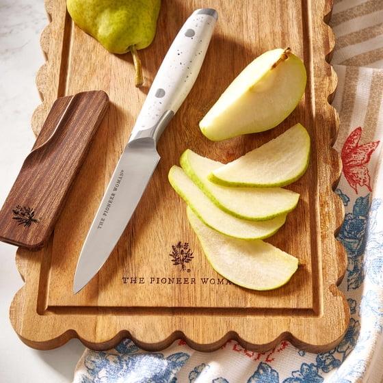 Whether you are peeling, cutting, or slicing, you'll find The Pioneer Woman Speckle Stainless Steel 3.5-Inch Paring Knife is indispensable. This knife is perfect for someone just starting in cooking or a more seasoned cook looking to upgrade their knife. The included sheath helps protect the knife and you from dings and nicks. The handle has an ergonomic grip that feels good in your hand and a speckled design in the color linen. Coordinate this unique knife with other cheerful items from The Pioneer Woman Collection. The Pioneer Woman Speckle Stainless Steel 3.5-Inch Paring Knife makes your everyday dicing and chopping easy.