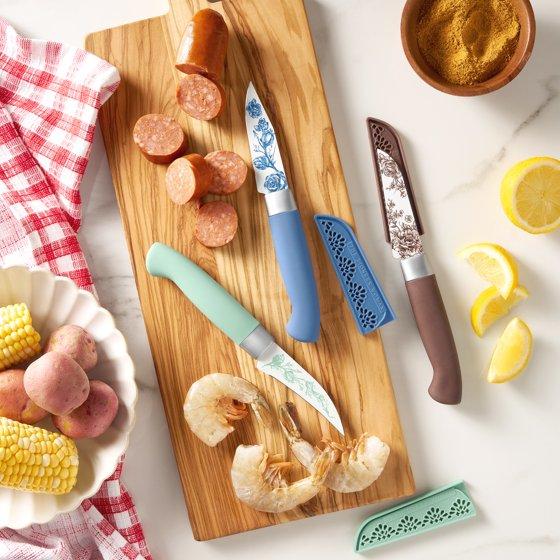 Bring some rustic flair to your kitchen with The Pioneer Woman Agatha 3-Piece Paring Knife Set. This three piece set is perfect for all your precision cutting needs and includes 3 pairing knives with sheaths. These knives feature stainless-steel blades for strength and durability, and the beautiful handles are ergonomically designed for long-lasting comfort. This set is perfect for someone just starting in cooking or a more seasoned cook looking to upgrade their kitchen knives. Hand wash only to help preserve the beauty of the pattern. Add a pop of color and country charm to your kitchen with The Pioneer Woman Agatha 3-Piece Paring Knife Set.Meet Ree:Ree Drummond is an author, TV personality, social media phenom, and the woman behind the popular Pioneer Woman lifestyle blog that started it all. She's also a lover of butter, basset hounds, Ethel Merman, her hunky, cowboy husband Ladd, and their four kids. Her casual country style and delicious recipes have made her a go-to for all things cooking and entertaining.